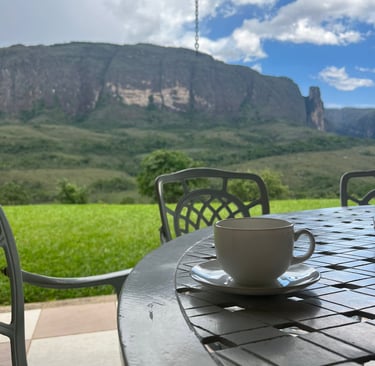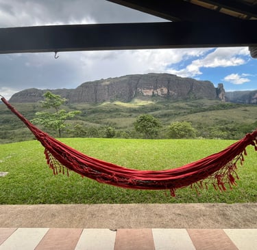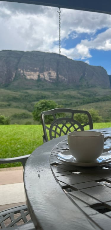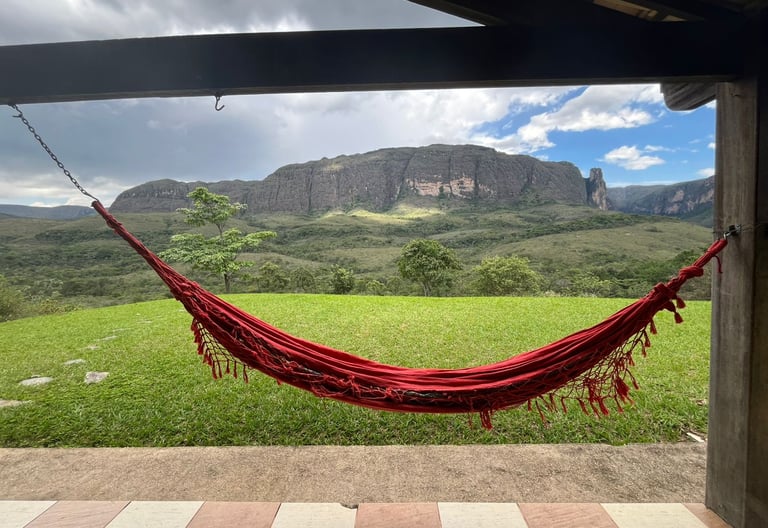 Um espaço acolhedor, com vista para a serra, perfeito para relaxar após as trilhas.