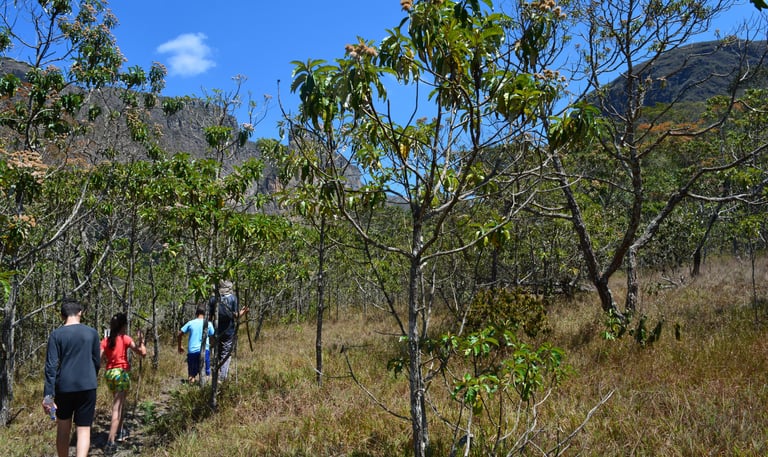 Trilhas à beira do rio, onde a paisagem se abre em belas vistas da serra.