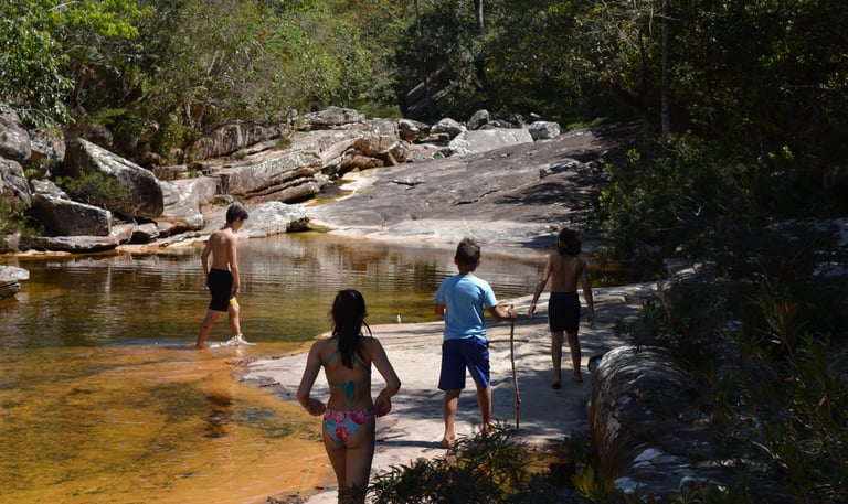 Banhos em quedas d'água cristalinas, acessíveis por trilhas de diferentes níveis.